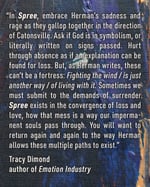 “In Spree, embrace Herman’s sadness and rage as they gallop together in the direction of Catonsville. Ask if God is in symbolism, or literally written on signs passed. Hurt through absence as if an explanation can be found for loss. But, as Herman writes, these can’t be a fortress: “Fighting the wind / is just another way / of living with it.” Sometimes we must submit to the demands of surrender. Spree exists in the convergence of loss and love, how that mess is a way our impermanent souls pass through. You will want to return again and again to the way Herman allows these multiple paths to exist.”